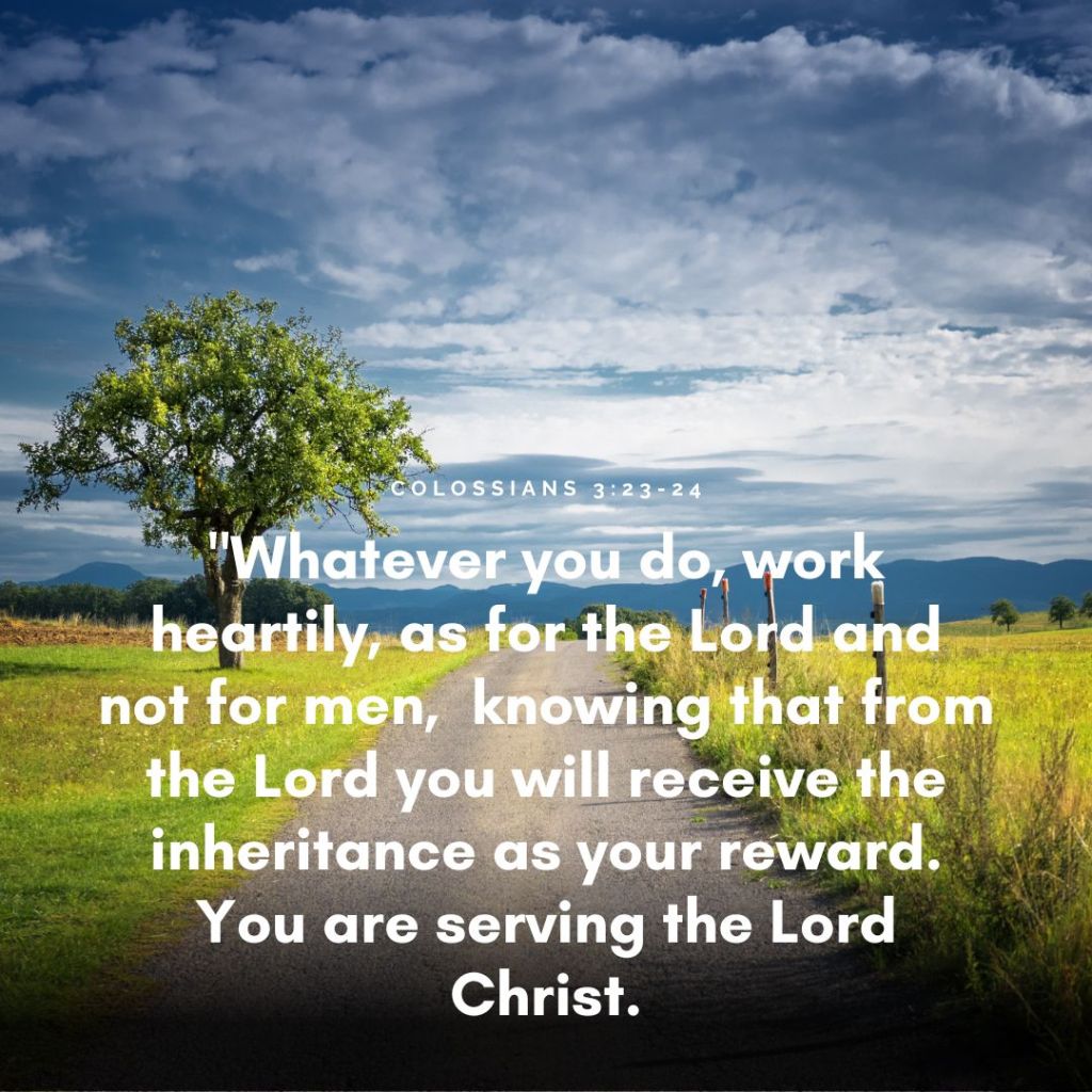 Dear Lord, Ecclesiastes 2:26 states, “For to the one who pleases him God has given wisdom and knowledge and joy.” Help us remember the message you gave us in Colossians 3:23-24 “Whatever you do, work heartily, as for the Lord and not for men, knowing that from the Lord you will receive the inheritance as your reward. You are serving the Lord Christ.” Lord, when we live by this verse, everything has a purpose, for we are working for you and your purpose. Thank you, Lord, for loving us and providing your Word to guide us. In Jesus’s name, we pray, Amen.